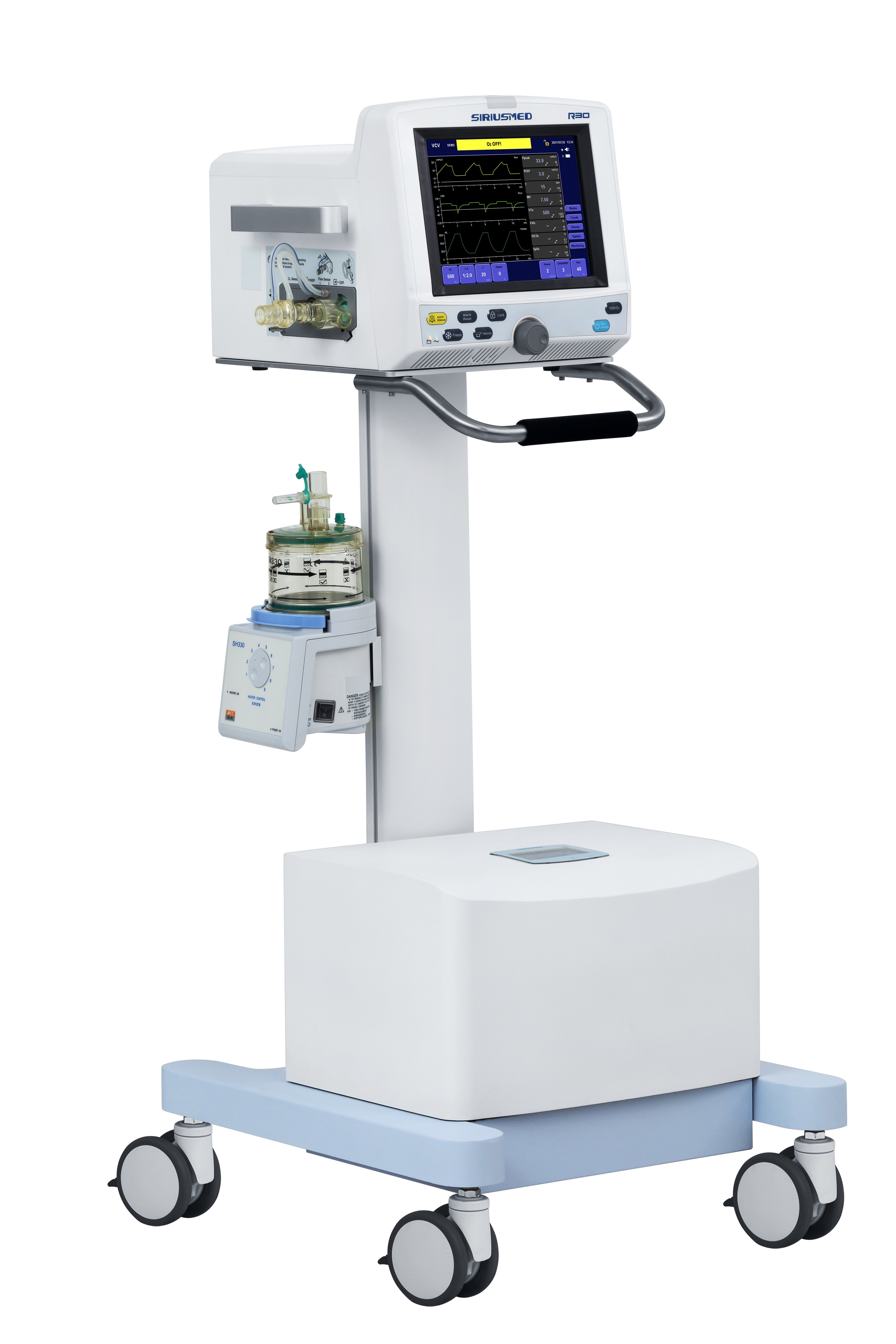 l 10,4”, exhibición de TFT, con la pantalla táctil l VCV, PCV, SIMV-VC, SIMV-P, CPAP/PSV, DE RESERVA (opcional: Duophasic/APRV, NIV) l pinta, pie, V-T (opcional: CO2-time, pulserate-tiempo) l lazo: PICOVOLTIO, F-V l batería de NI-MH, >120mins l RS232, VGA, USB, alarma remota